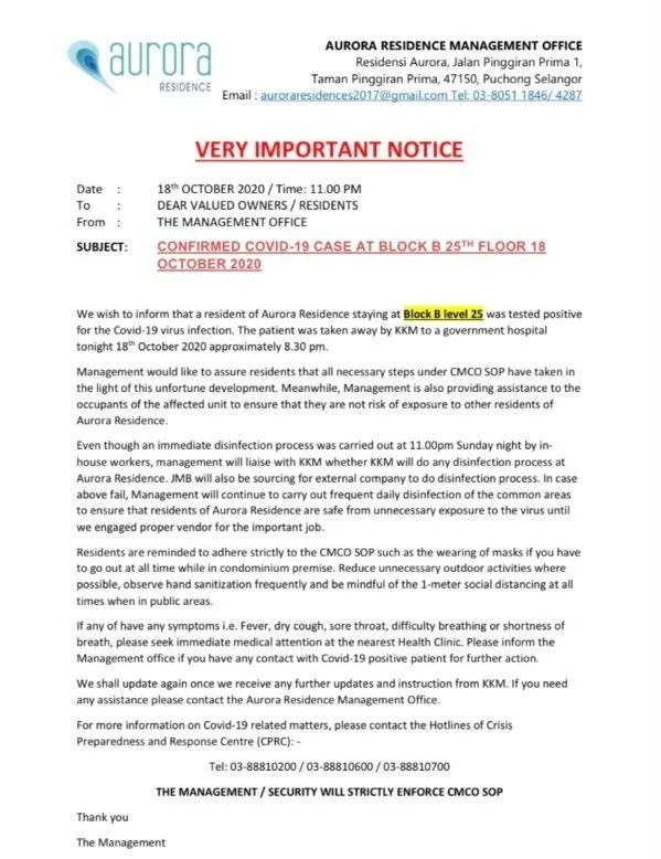 Folks living at Aurora Residence were notified by the management that a tenant living at Block B, level 25, is seeking treatment at a government hospital after contracting the virus. Disinfection process was carried out by in-house workers on Sunday night (11pm).