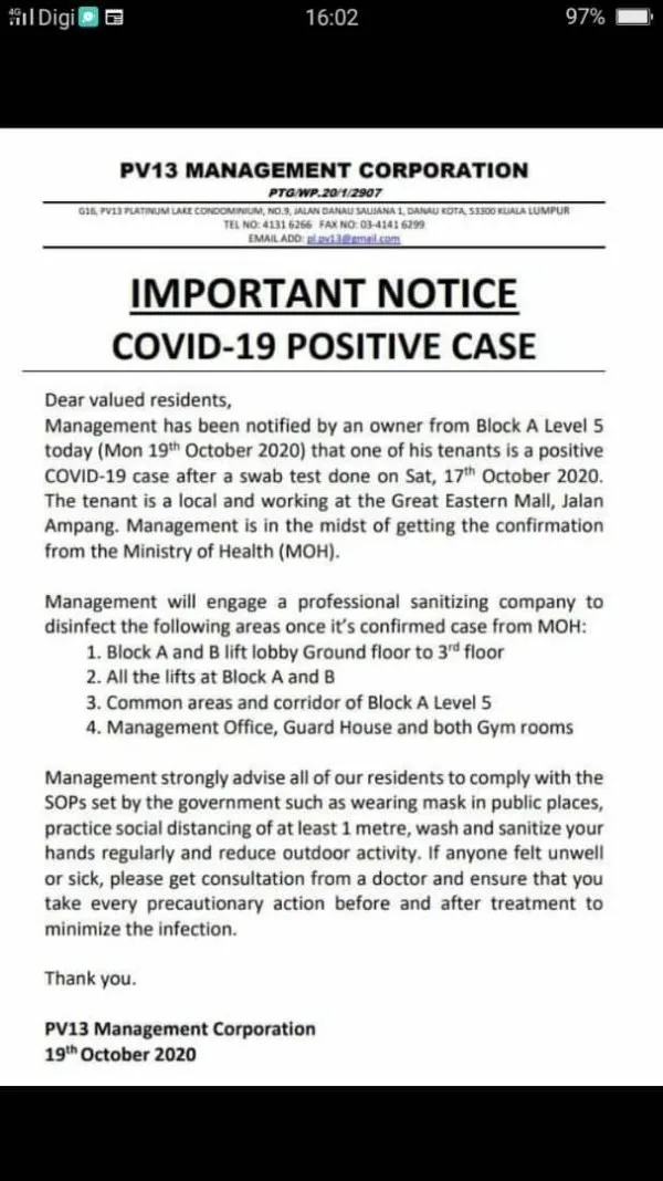 Residents living in PV13 Platinum Lake were informed that someone living in Block A, level 5, had tested positive for Covid-19 after receiving a swab test during the weekend. It is also understood that the tenant is local and works at Great Eastern Mall in Jalan Ampang. However, we’re not sure if it’s connected to the case at Menara Great Eastern.