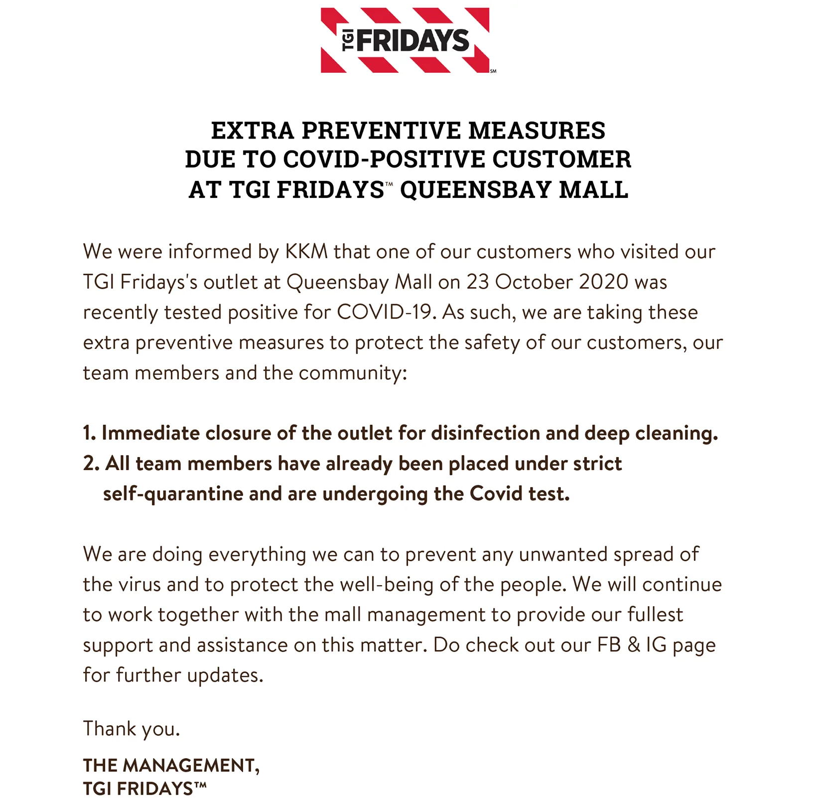 A customer who visited TGI Fridays in Queensbay Mall, Penang last Friday (23rd October) had tested positive for Covid-19. To ensure everyone’s safety, the outlet was closed for disinfection and the team members working there were asked to get tested and self-quarantine at home.