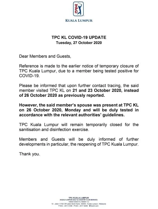 The management from Tournament Players Club (TPC) Kuala Lumpur and Royal Selangor Golf Club confirmed that a member (who played golf at the premises over the weekend) had contracted Covid-19. Meanwhile, his wife was last seen there on 26th October. TPC Kuala Lumpur will be closed until further notice. Royal Selangor Golf Club, on the other hand, is suspending its activities until 30th October.