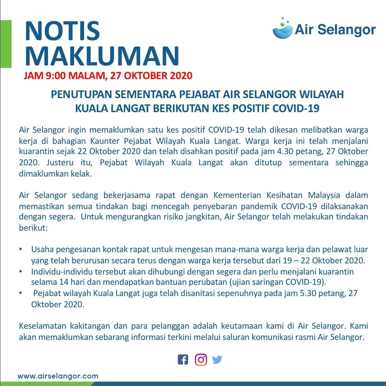 One of Air Selangor’s employees stationed at the Kuala Langat regional office was confirmed positive for coronavirus on 27th October at 5:30pm. “As such, the Kuala Langat regional office will be closed temporarily until further notice. Air Selangor is working closely with the Health Ministry to ensure action to prevent the spread of the virus is implemented immediately,” the company stated.