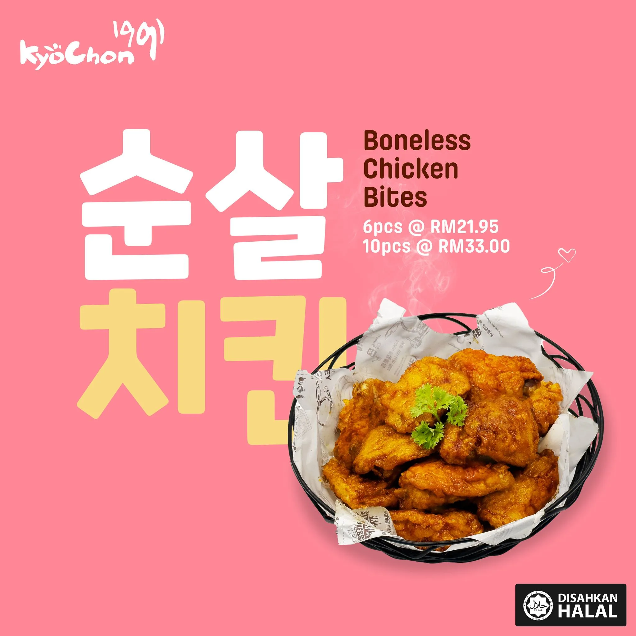 - To present the “Buy 6 Free 4pcs Boneless Chicken Bites” post on any of KyoChon 1991 social media (Facebook/ Instagram/ Twitter/ Website) to our crew before ordering. Valid for dine-in and in-store takeaway only. Not valid for web ordering and delivery.