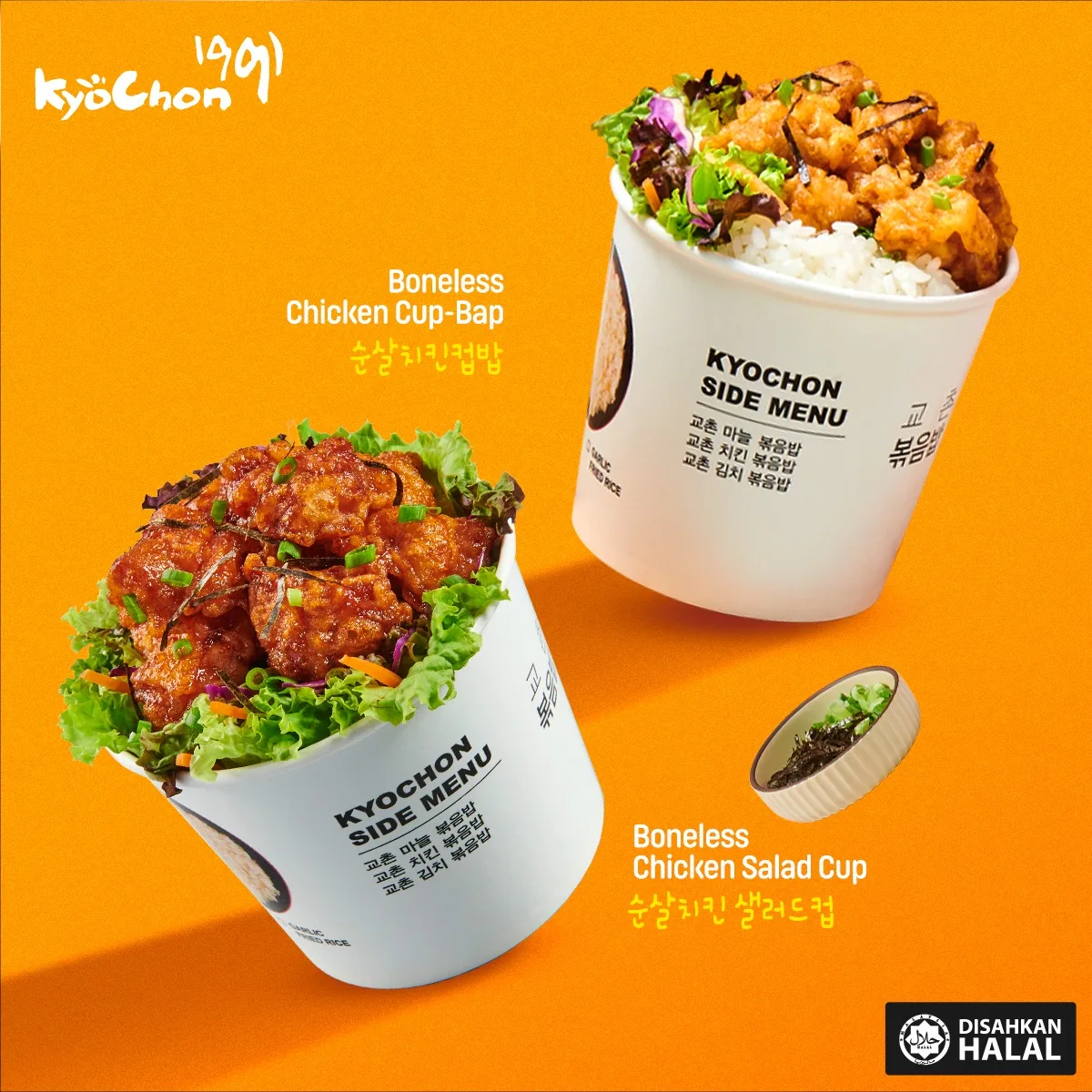 Don’t let your busy schedule get in the way of enjoying your favourite Korean fried chicken. Enjoy the delicious taste of KyoChon 1991’s boneless chicken on-the-go with the all new Boneless Chicken Cup-Bap & Salad Cup! Choose from Soy Garlic or Red Pepper chicken, and pair it with rice or a salad. The price of the Boneless Chicken Cup-Bap & Salad Cup is RM13.95, order yours today and satisfy your craving for the best Korean fried chicken in town, even on a busy day!