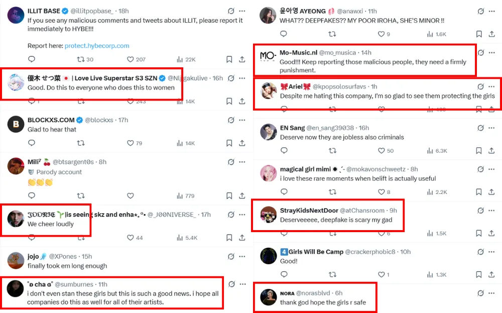 Fans have reacted to the news, expressing relief that the perpetrators have received punishment. Some also expressed concern towards the ILLIT members, noting the stress of being sexually harassed. Others also hope for many more K-pop agencies to take similar action because deepfakes are a rampant issue in the industry and are affecting many female idols, including TWICE and BLACKPINK.