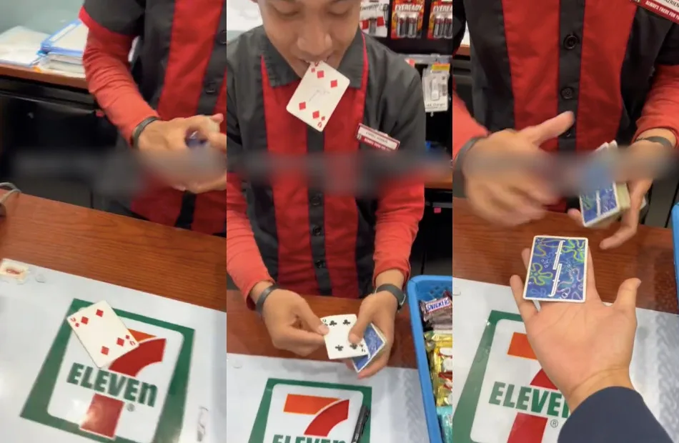 Yesterday (Tuesday, 9th May), Twitter user @jillmisai posted a video of a 7-Eleven cashier showing off his magic skills to a customer. The netizen did not, however, mention if he was the one recording or if the video came from another source. In the video, the cashier started off his “show” by performing a simple trick where the customer had to pick a card from a deck.