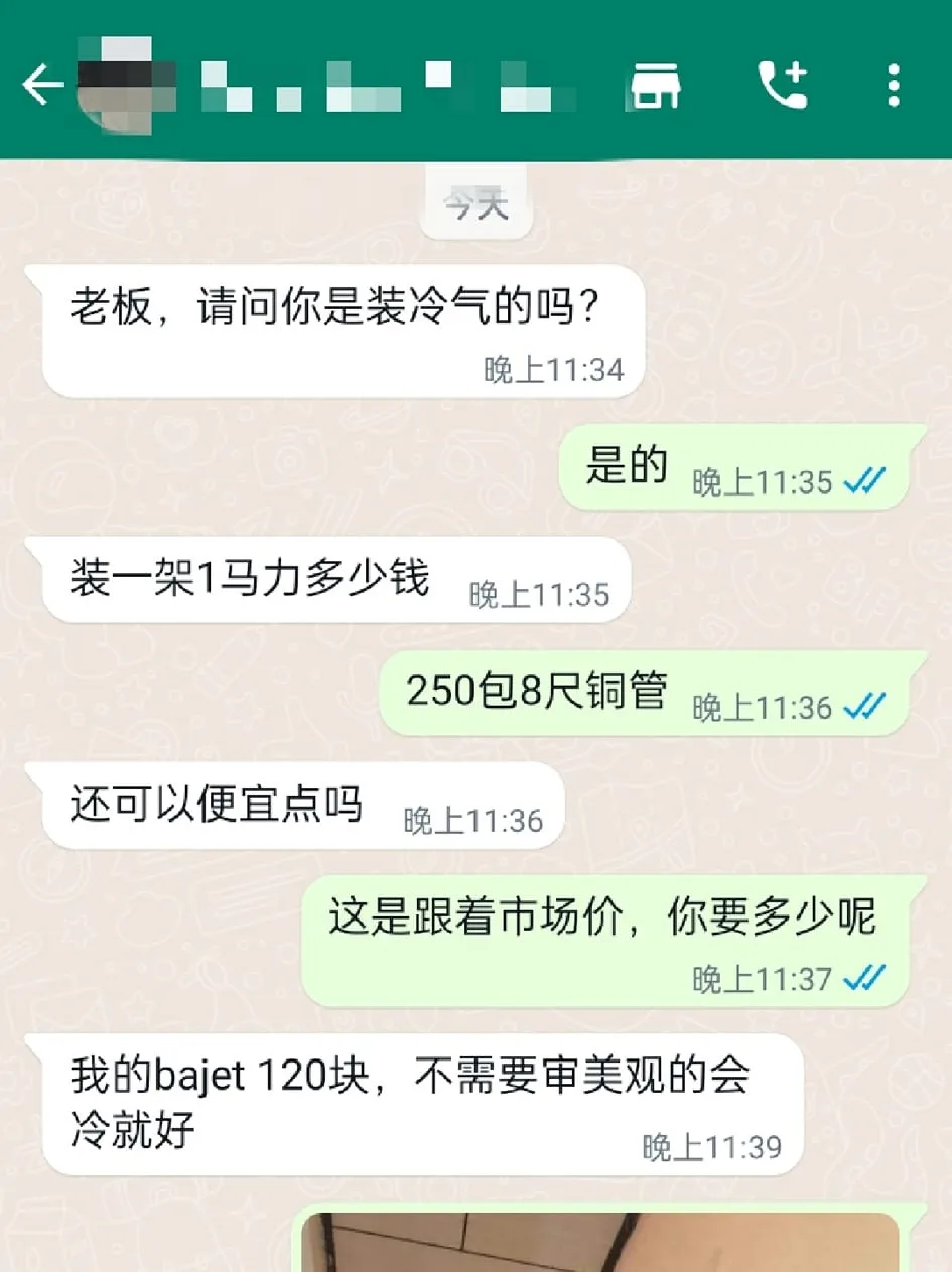 A Facebook user going by the name Ang Kong Sing posted 2 screenshot photos of a conversation between a customer and an air-conditioner technician. In the Whatsapp conversation above, the customer said he wanted to install a 1-horsepower air-conditioner at his house.