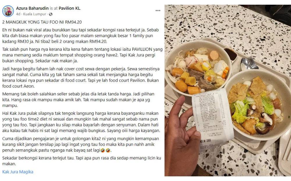 In a Facebook post, Azura Baharudin shared her experience ordering yong tau foo at the Pavilion Kuala Lumpur food court. While most food courts offer cheap food options, the food at Pavilion’s food court can get pretty pricey, explaining why Azura had to fork out a whopping RM94.20 for two bowls of yong tau foo.