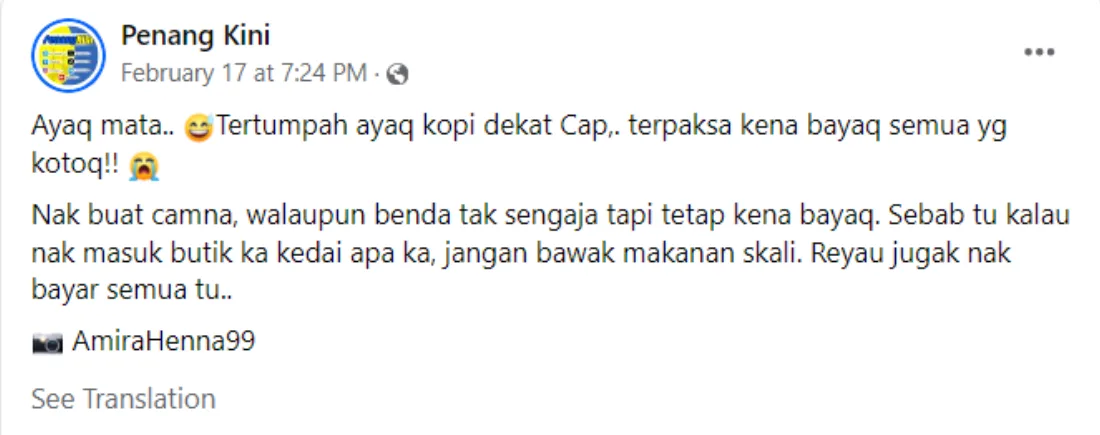 Facebook page Penang Kini shared about the incident, explaining a Malaysian had to buy over ten caps from a store after accidentally spilling coffee onto them. It is believed that the customer entered the store with a cup of coffee but accidentally spilled their drink onto the cap display rack due to their carelessness. The incident resulted in several caps getting stained by the coffee. As with most store policies, the customer had to purchase all the stained caps to make up for their mistake.