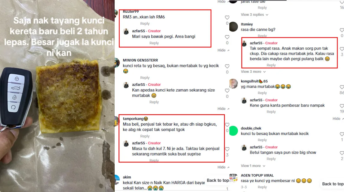 As shown in the screenshot above, the TikTok user humorously tried to highlight his frustration by placing his car key—purchased two years ago—next to the murtabak to compare their sizes. It’s clear from the image that the two items are almost identical in size. In his replies to netizens in the comments section, the man revealed that the murtabak cost him RM6.