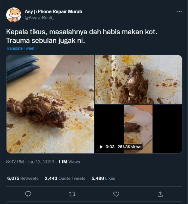 Just the thought of a head animal is already enough to make anyone sick to their stomach. A Twitter user who goes by @AsyrafRosli_ posted 2 photos and a video earlier this week of his or someone else’s Nasi Kukus meal. It was not mentioned if the user is the original source for the content but nevertheless, netizens were terrified at the sight of what appears to be a cooked rat’s head in the meal.