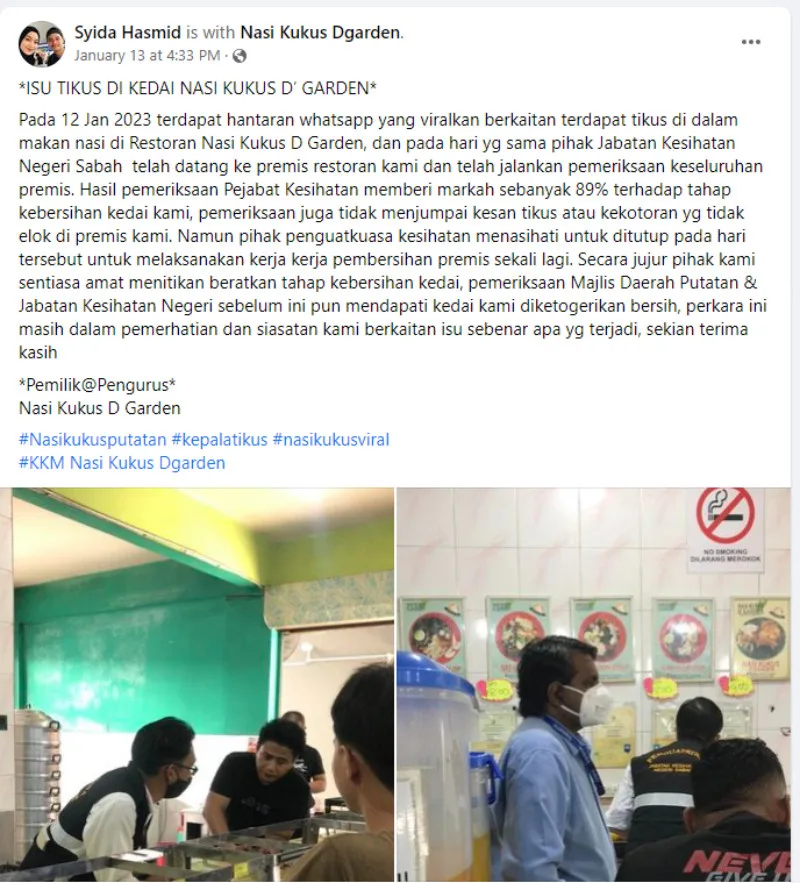 Soon after the tweet went viral, the restaurant owner released an official statement. The incident apparently took place at Restoran Nasi Kukus D Garden in Kota Kinabalu. According to the statement, officials from Sabah Health Department arrived on the same day and conducted an inspection of the establishment. It was said that the inspectors did not find any traces of rats or signs of uncleanliness.