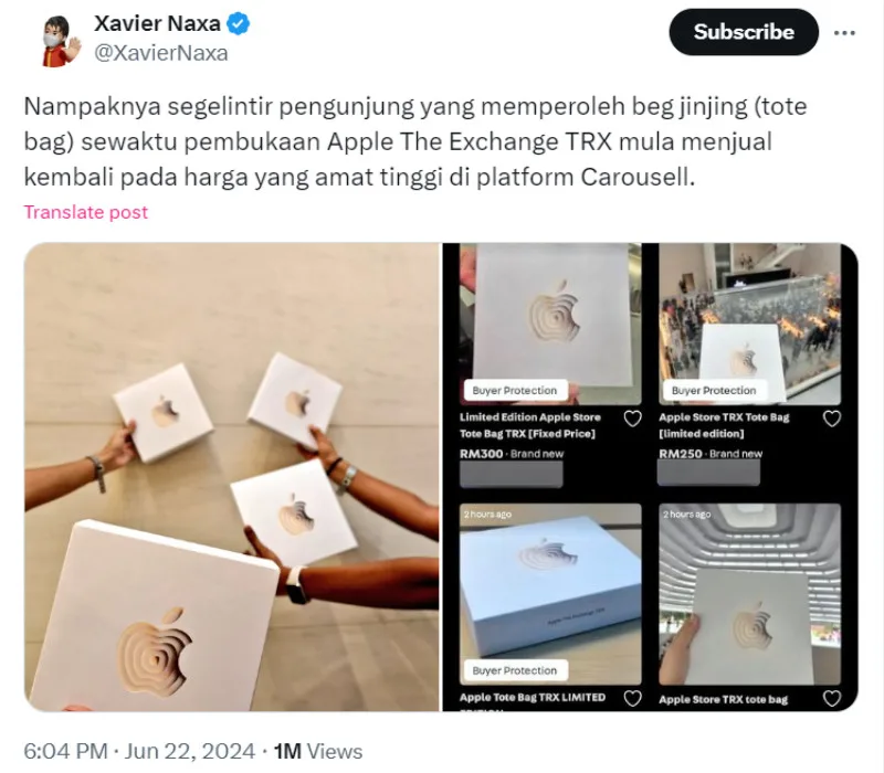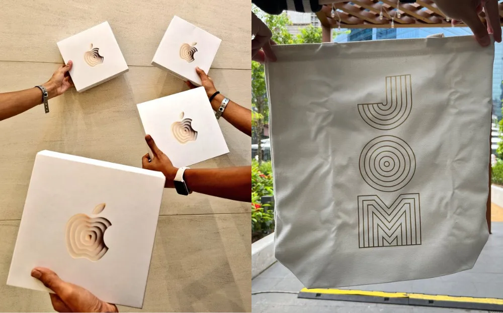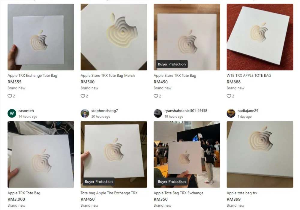 In Malaysia, it’s common practice for stores to offer a free gift to the earliest customers during their grand opening – and the Apple Store was no exception. The tech giant gave out a limited edition tote bag with the words “JOM” printed on the front and “Apple The Exchange TRX” printed on the back to commemorate the special day. The bag was given to the earliest people in the queue on opening day. However, later that same day, netizens noticed that the complimentary item was already getting resold online.