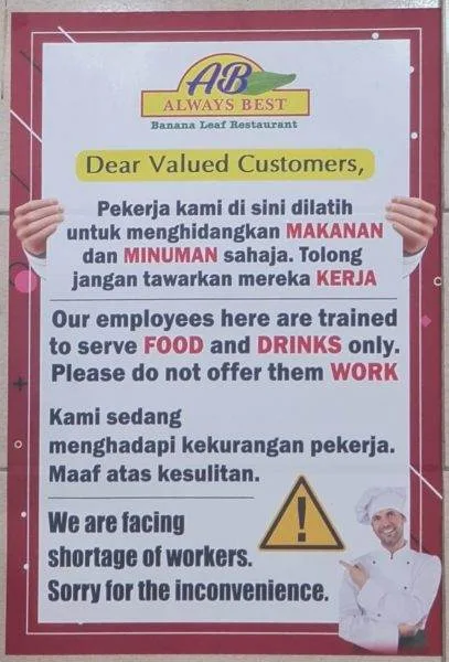 “Dear valued customers, our employees here are trained to serve food and drinks only. Please do not offer them work,” the notice read, “We are facing shortage of workers. Sorry for the inconvenience.”