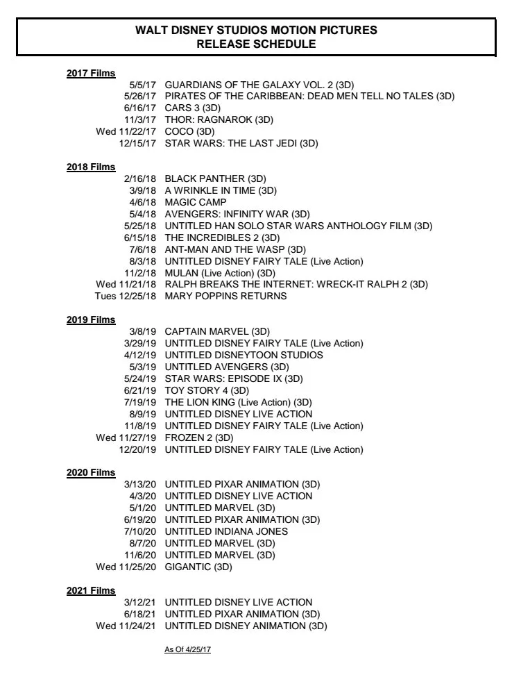 Check out the updated Disney movie slate through 2021 below: