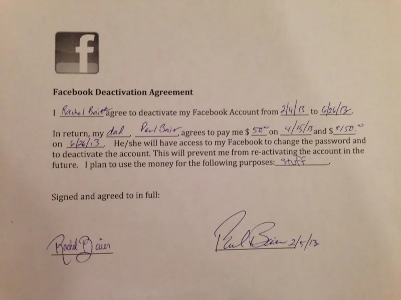 Sounds like a cruel father condoning an act of bribery but here’s the best part – it was all Rachel’s idea. Apparently, she wants to earn money but finds Facebook a distraction and a waste of time. Hence the contract!