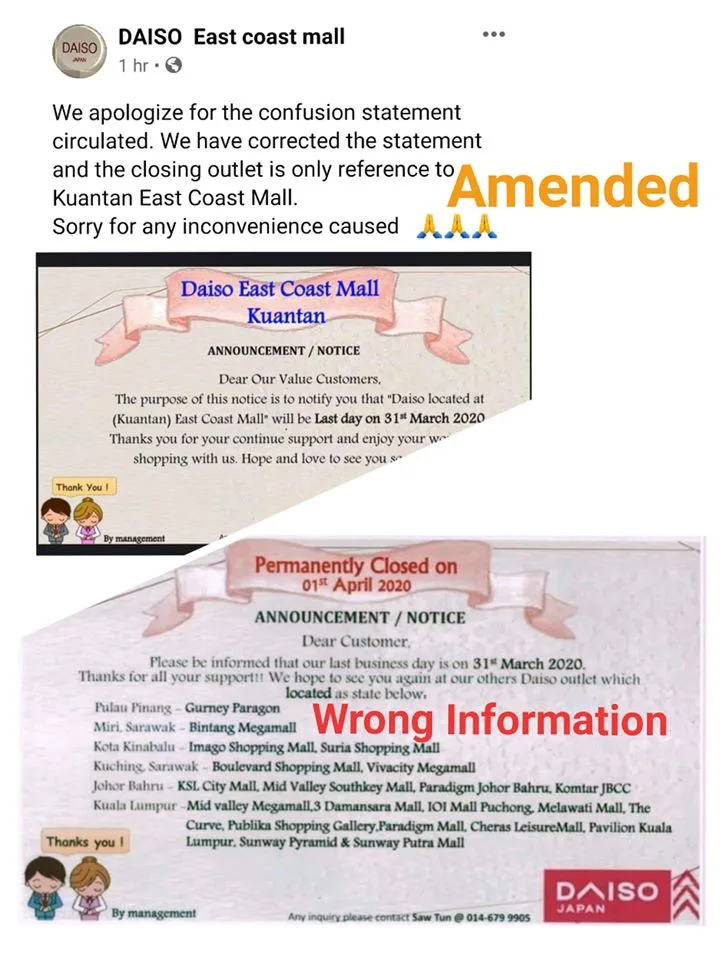 However, Daiso has come forth to rectify the situation – explaining that the previous poster was only meant for Daiso Kuantan East Coast Mall. The management intended to reassure customers that outlets in Kuala Lumpur, Johor Bahru, Kuching, Kota Kinabalu, Miri and Pulau Pinang were still operating as usual.
