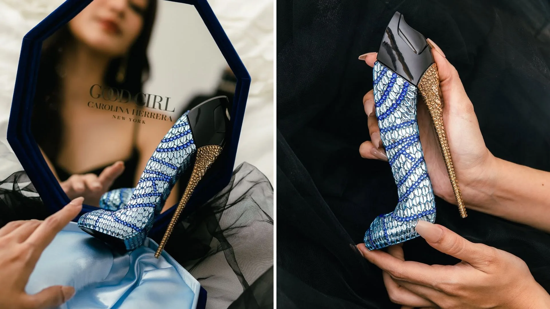 The iconic Good Girl stiletto bottle takes on new brilliance with over 2,000 hand-applied Swarovski crystals, each placed with precision over 18 hours. Featuring a captivating gradient of sapphire and aquamarine crystals, paired with a golden heel encrusted in Light Colorado Topaz, the design captures the perfect balance of power and elegance. The bottle is presented in a plush blue velvet case, evoking the timeless luxury of fine jewellery.