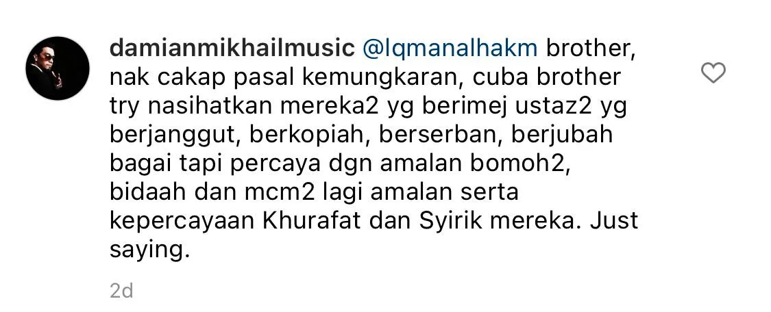One of Damian’s statements amongst the paragraphs of debates between him and the netizen, “Brother, if you would like to talk about wickedness, try advising those who (brings the image of religion and piousness) but still believes in the practice of black magic.”