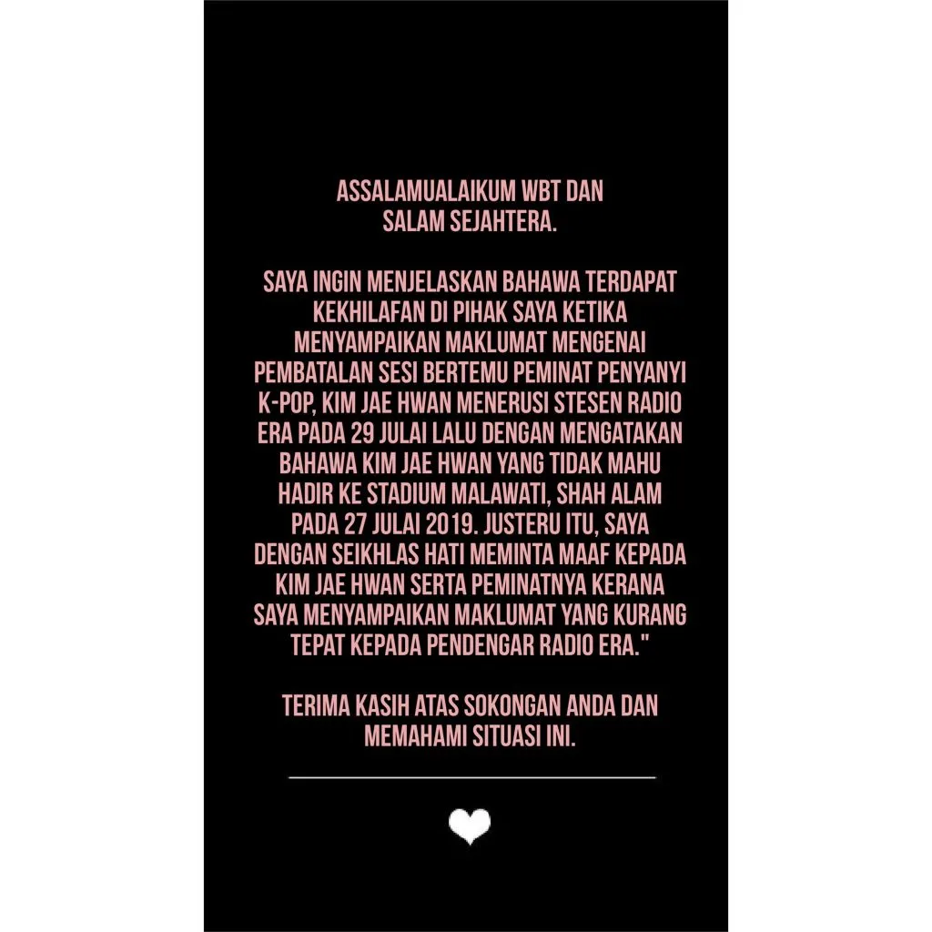 In the lengthy post, the presenter who is also known as a comedian admitted to his mistake. He previously assumed that the K-pop star refused to show up at the concert venue at Stadium Malawati and proceeded to broadcast it.