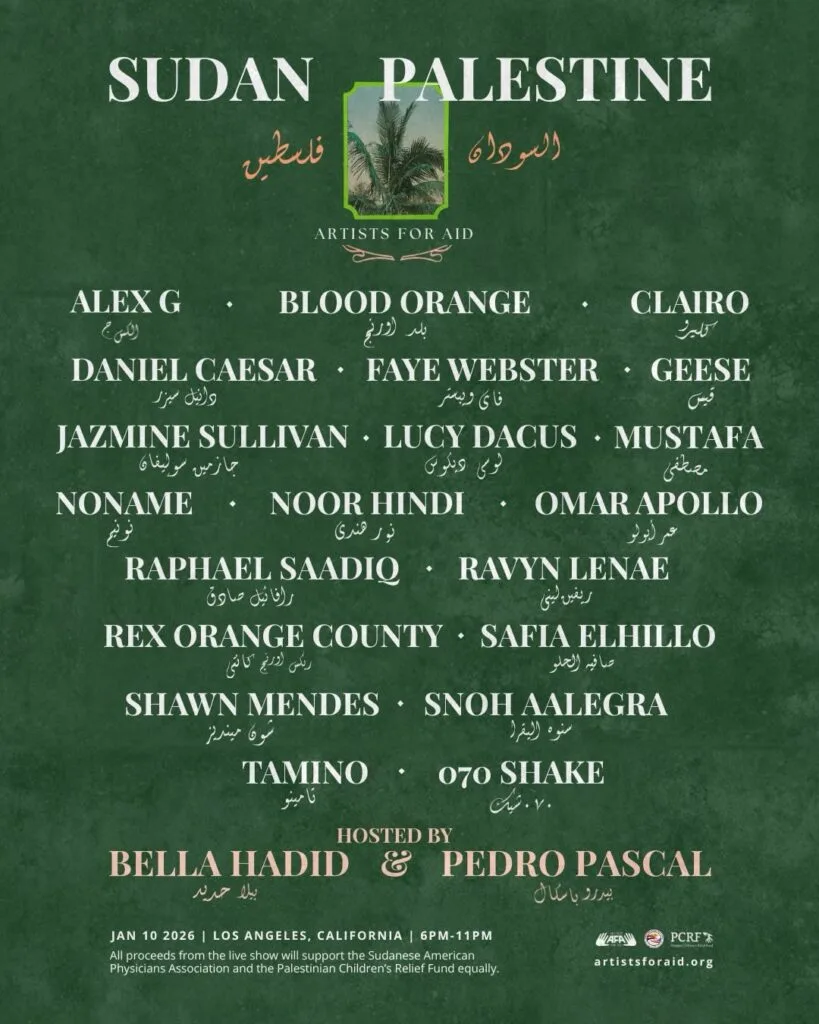 Besides Mustafa, the other stars performing at the benefit concert are Alex G, Blood Orange, Clairo, Daniel Ceaser, Faye Webster, Geese, Jazmine Sullivan, Lucy Dacus, Noname, Noor Hindi, Omar Apollo, Raphael Saadiq, Ravyn Lenae, Rex Orange County, Safia Elhillo, Shawn Mendes, Snoh Aalegra, Tamino, and 070 Shake. Model Bella Hadid and actor Pedro Pascal will also join as hosts.