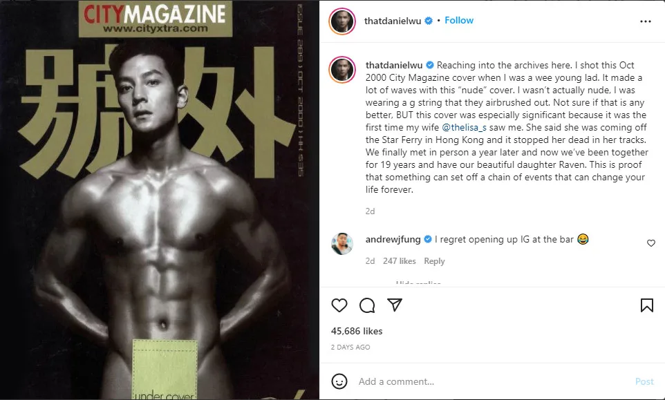 Hong Kong-American actor, director and producer Daniel Wu (吴彦祖) can attest to that. The star recently shared the incident which sparked the meeting between him and his wife, former model Lisa Selesner.