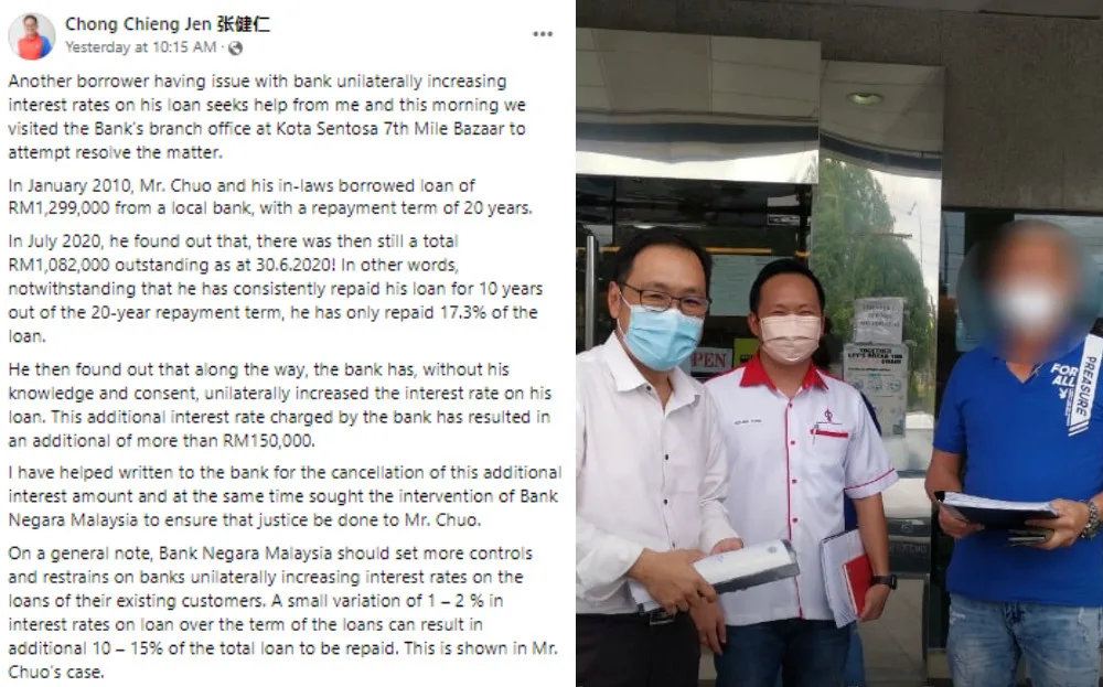DAP Sarawak State Chairman Chong Chieng Jen (张健仁) released a statement yesterday (31st March) regarding the issue. Apparently, Mr Chong had been approached by a borrower, Mr Chuo. He claimed the bank was unilaterally increasing interest rates on his loan. The borrower hoped Mr Chong would be able to help.