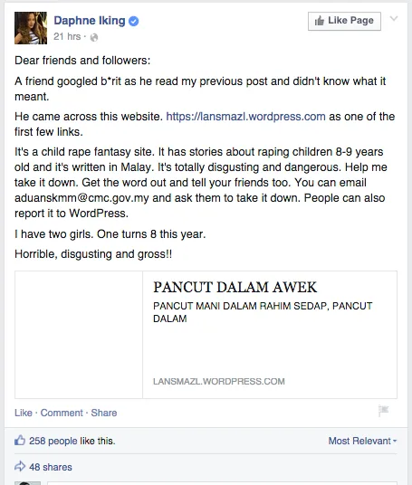 The website, which apparently has been around since January 2013, depicts stories of rape and incest with younger children. It came to the attention of local celebrity Daphne Iking recently, who has since called on netizens to help take it down. She posted the link and urged her friends and followers to write to the Malaysian Communications and Multimedia Commission (aduanskmm@cmc.gov.my) to take action against the website.