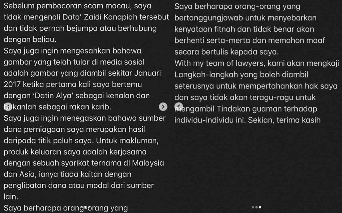 She stated, “Recently, I’ve come to know that a few individuals on social media have been releasing defamatory and untrue statements against me by claiming that I started my business with funds obtained from an individual named ‘Dato’ Zaidi Kanapiah’ and that I was involved in the ‘Macau Scam’ activity, as well as online gambling.”