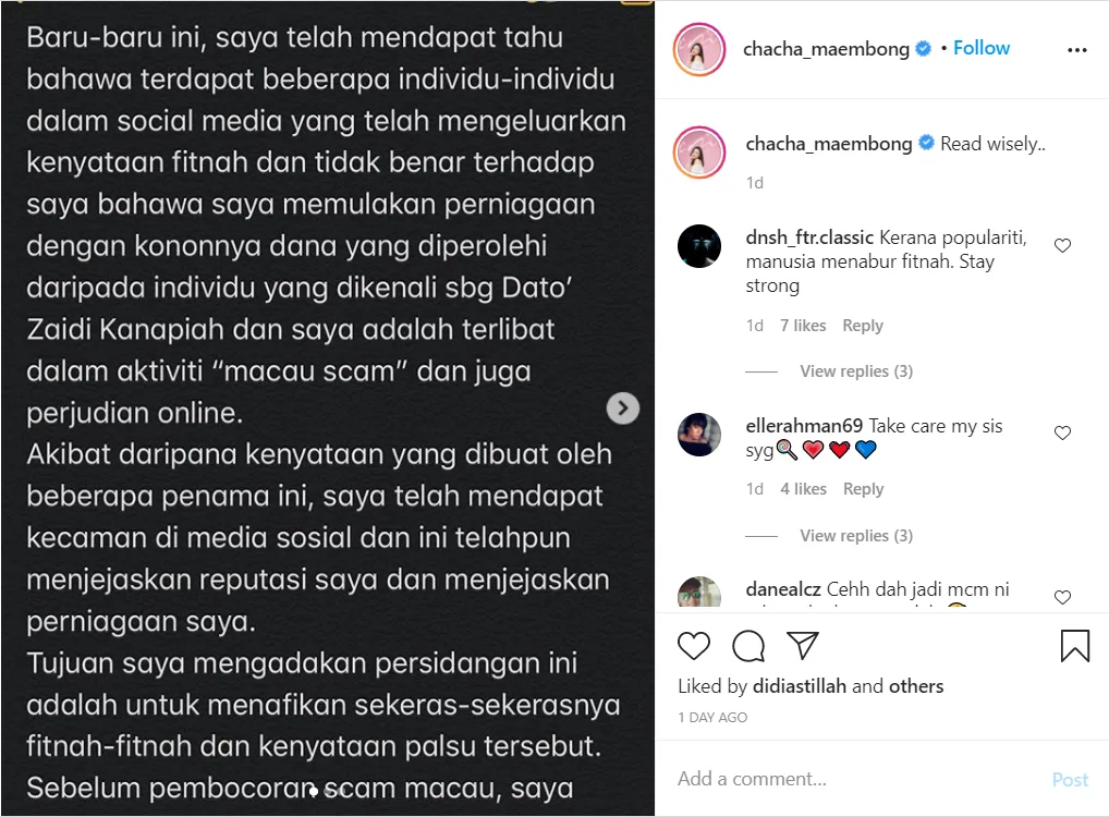 She added, “I’ve stated before that me and my husband are not part of the Macau Scam (syndicate). If I’m lying, I would’ve run away and shut my IG down. Nonetheless, people keep slandering us saying that we’re (a part of) Macau Scam. Did TV3 news mention our names?”
