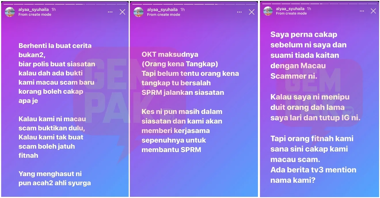 Datin Alyaa, who was also reportedly detained by the MACC to aid with the ‘Macau Scam’ investigation, was unhappy and upset with people pointing fingers at her husband. She took it to her Instagram profile, @alyaa_syuhaila, posting several IG stories to call out against the accusations.