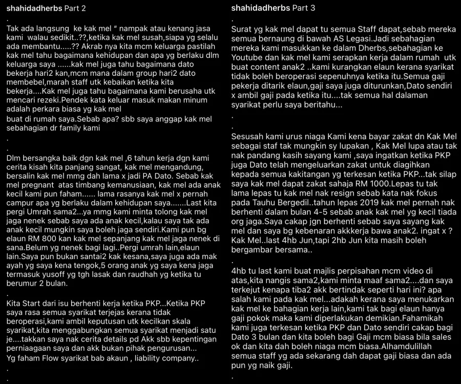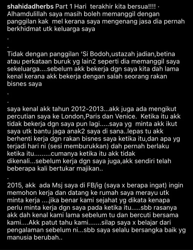 Having said that, Shahida clarified that the posts were not meant to put Kak Mel on blast. Instead, she just wanted to shed some light on the real situation in order to prevent her family from being looked down upon by the public.