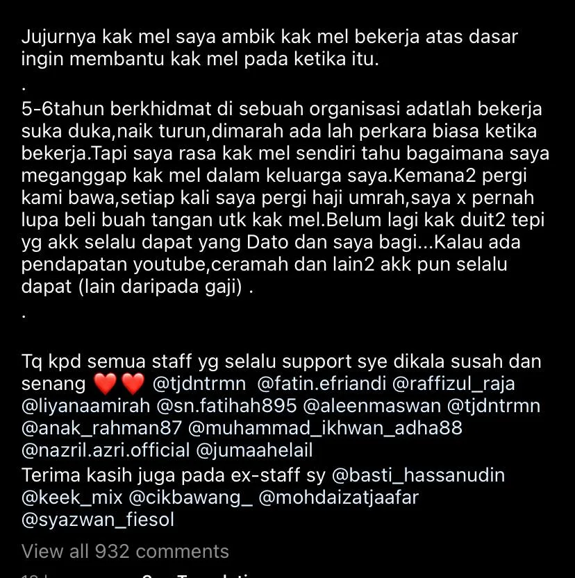 She explained, “I wrote this not to embarrass Kak Mel. She did a very good job in taking care of our children as well as our family. Hopefully, netizens can stop the assumptions and negativity in the comments section. I just want to explain the situation so that people will not continue to think badly of us.”