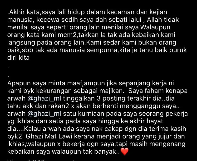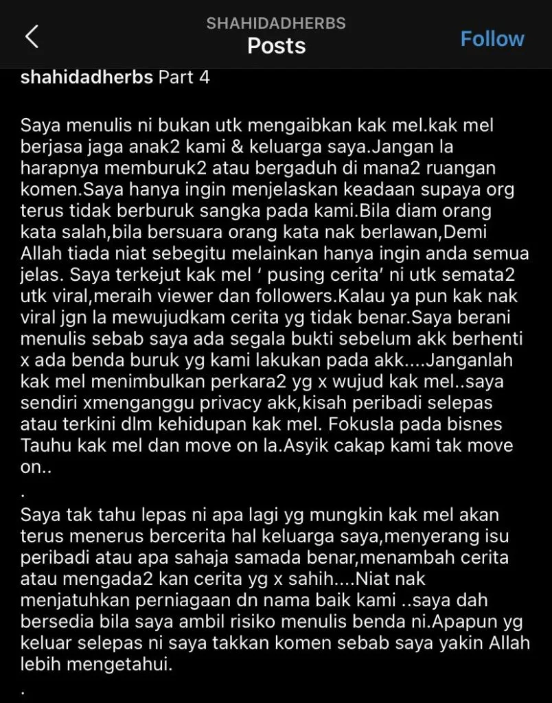 The former nasheed songbird continued, “If you want to go viral, do not create a false story. I dare to come up with this post because I have all the evidence. Before you quit your job, we never treated you badly. Please Kak Mel, do not bring up things that never happened.”