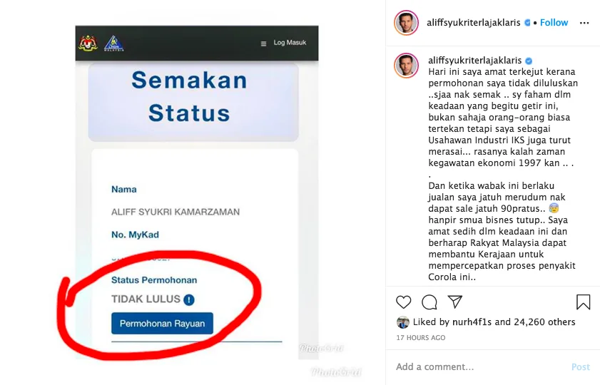 Dato’ Aliff Syukri recently posted a screenshot of his Bantuan Prihatin Nasional (BPN) application review status on his Instagram. Much to his dismay, it was revealed that he’s not eligible to receive the financial aid from the government.