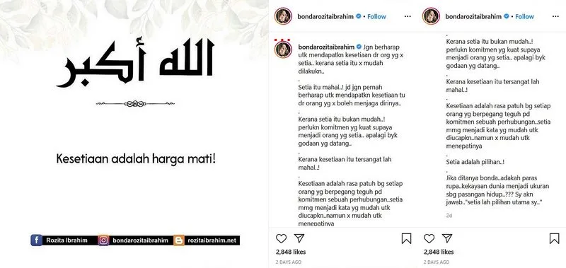 Netizens believed that the aforementioned post was directed to Datin Shahida. In the post, she wrote, “Loyalty is a fixed price. Don’t expect to earn loyalty from people who are unfaithful. Because it’s not easy being loyal. Loyalty is expensive! It takes a lot of commitment to do so, let alone there’s a lot of temptations coming your way.”