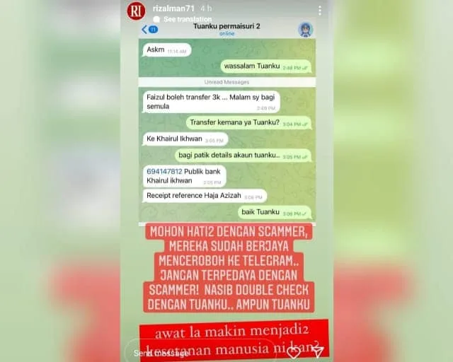 As seen in the conversation posted on Rizalman’s IG Story, the sender (“Tuanku Permaisuri Agong”) had asked Faizul to transfer RM3,000 to a man known as Khairul Ikhwan. That being said, it appears that the scammer failed to deceive him. After receiving the text on Telegram, Rizalman immediately checked with the Queen herself on the matter.