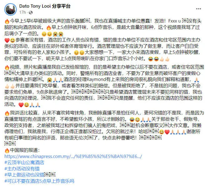 Dato’ Tony and his family had been having a lovely holiday in Genting Highlands. But yesterday (6th March), he took to Facebook to share how his peaceful holiday had been disturbed. Apparently, an ongoing event by The Viper Challenge had woken him up at 5am!