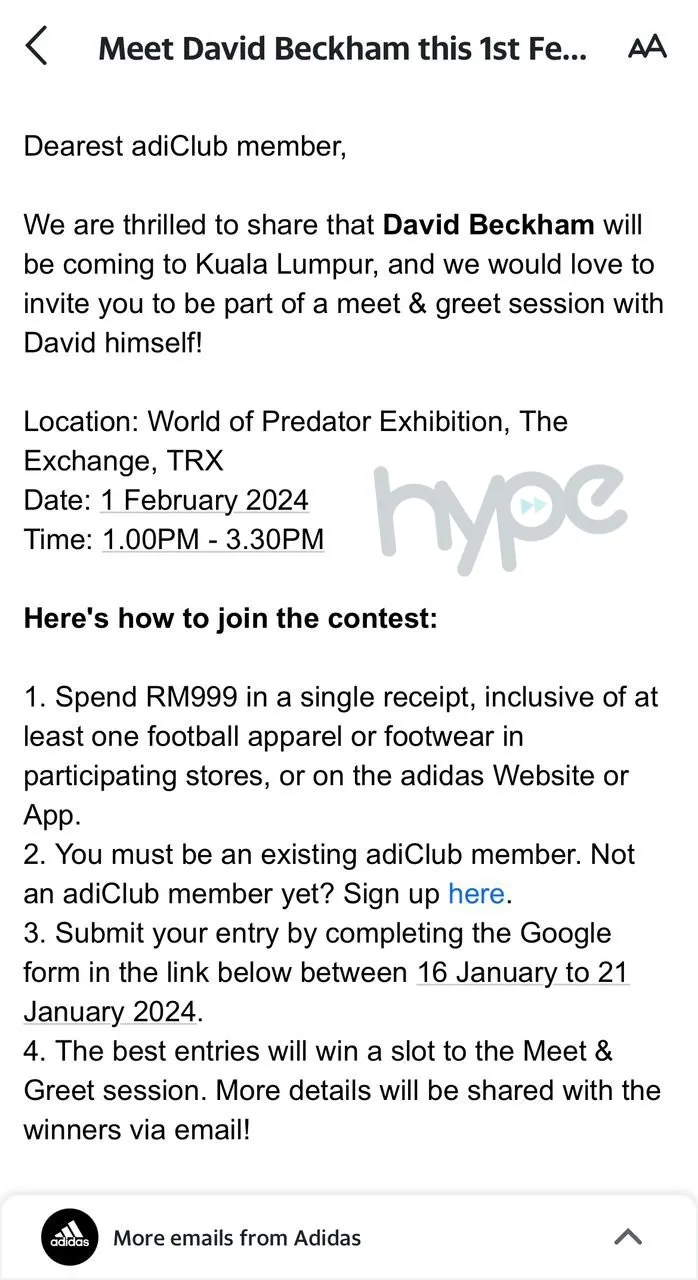 Not much has been officially revealed yet, however, several adiClub members have taken to social media to share the exciting email they received from adidas. It’s apparently a contest for members to stand a chance to win a meet and greet session with David Beckham himself.