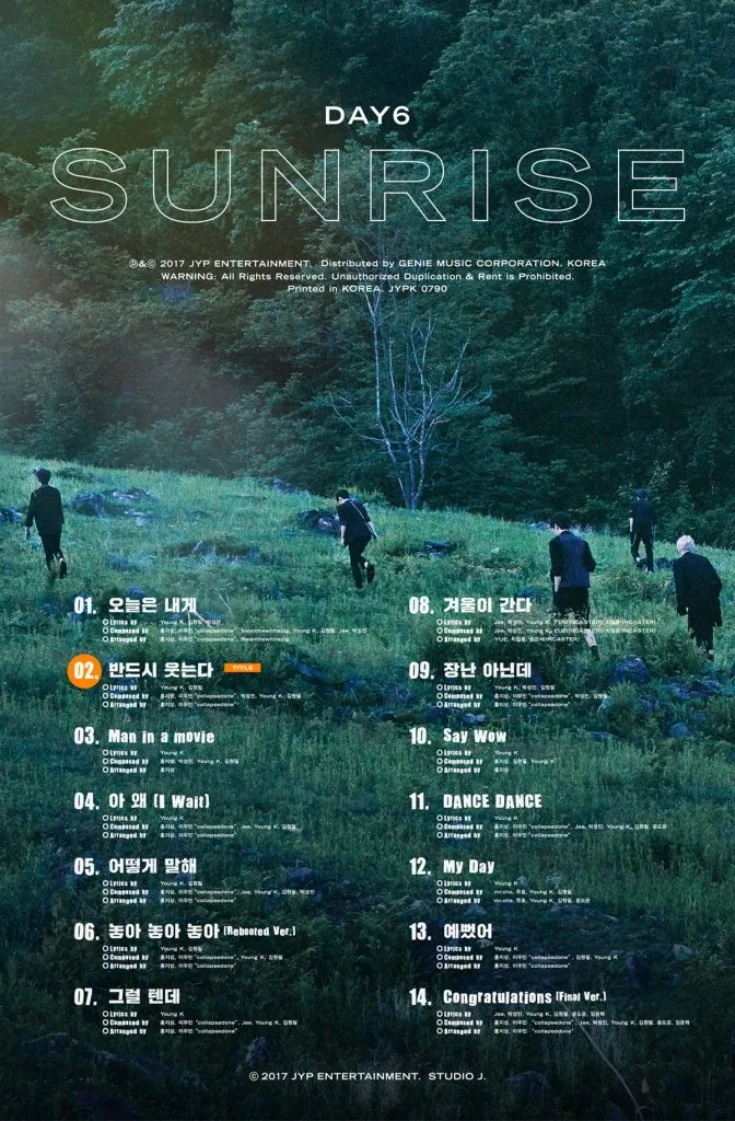 More specifically, the songs are “You Were Beautiful (예뻤어)“, “My Day”, “Dance Dance”, “Say Wow”, “I’m Serious (장난 아닌데)“, “Goodbye Winter (겨울이 간다)”, “I Would (그럴 텐데)”, “How Can I Say (어떻게 말해)”, “I Wait (아 왜)”, and “Man In A Movie”. There will also be a rebooted version of “Letting Go (놓아 놓아 놓아)” and final version for their debut track “Congratulations”. Day6 will also present fans with 2 new tracks – “Definitely Smiling” (literal title) and “To Me Today” (literal title).