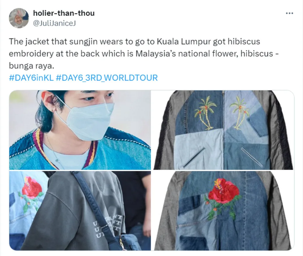 The outfit seemed simple, but the jacket’s design was what had Malaysian fans showering Sungjin with praise because, on the back, there was a large embroidered hibiscus flower. The front of the jacket has two embroidered coconut trees on the chest area. As the hibiscus flower is the national flower of Malaysia, local MyDays praised the singer, saying his outfit choice was apt for his first trip to the country.
