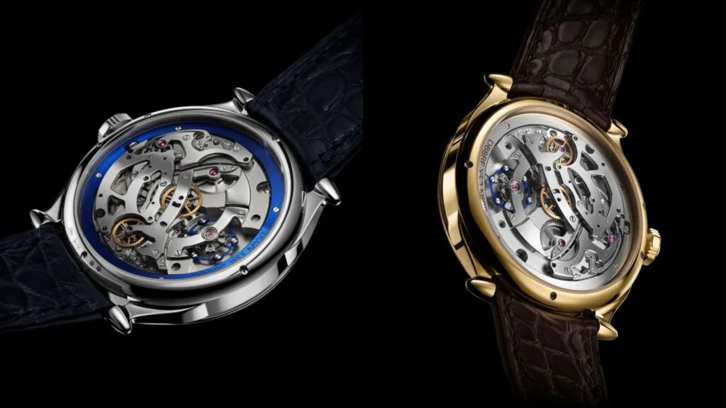 Each cursive Arabic numeral and delicate leaf-shaped hands is carefully crafted to create a sophisticated look, while also echoing their respective case materiality. The watch is 9.2mm thick, with ogival lugs. The entire mechanism is powered by the DB3000 manual-winding movement, which is visible through the open sapphire crystal caseback.