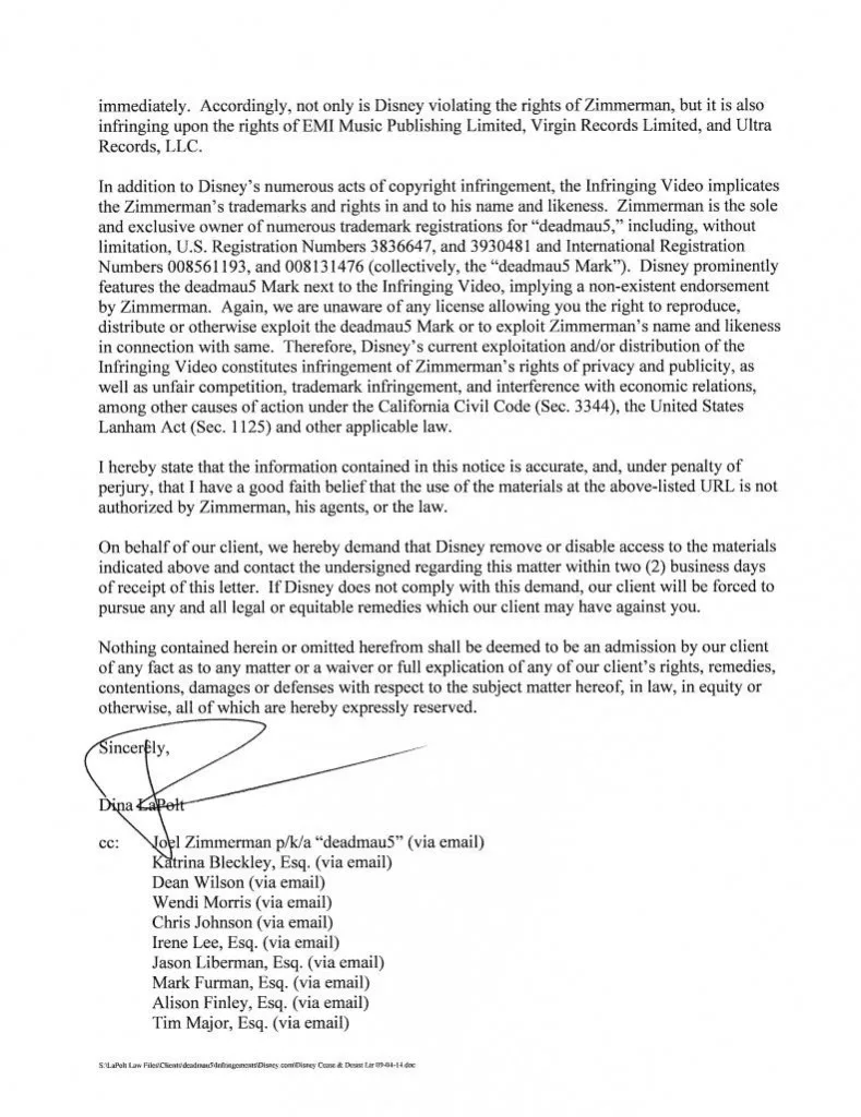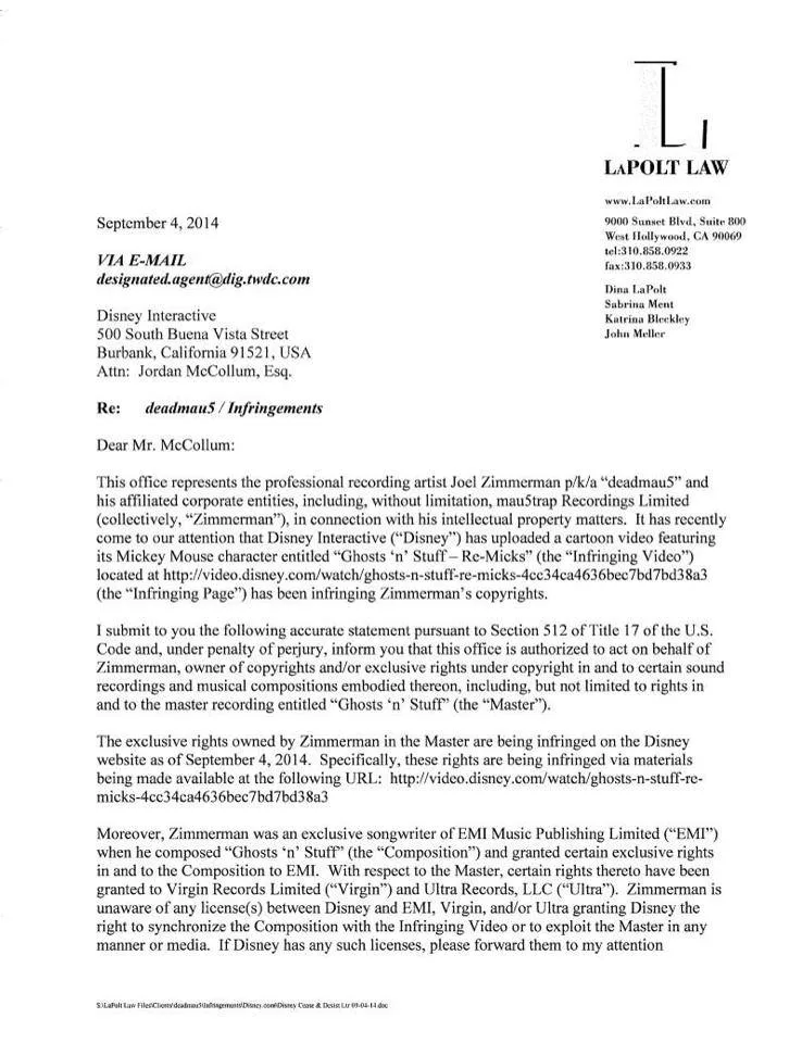 He also tweeted, “okay mouse … i never gave disney a liscene to use my track. So. we emailed you a C&D.” After which, he uploaded images of a cease-and-desist letter, in which deadmau5’s attorneys argue that Disney has been infringing his copyrights.