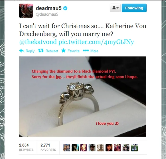No, seriously, that was Kat Von D’s actual response. On the hindsight, we can’t say that we didn’t see this coming, since they’ve always been one of the lovey-dovey-est couples on Twitter. We’re just glad that deadmau5 has finally sorted himself out and manned up enough to pop the question.