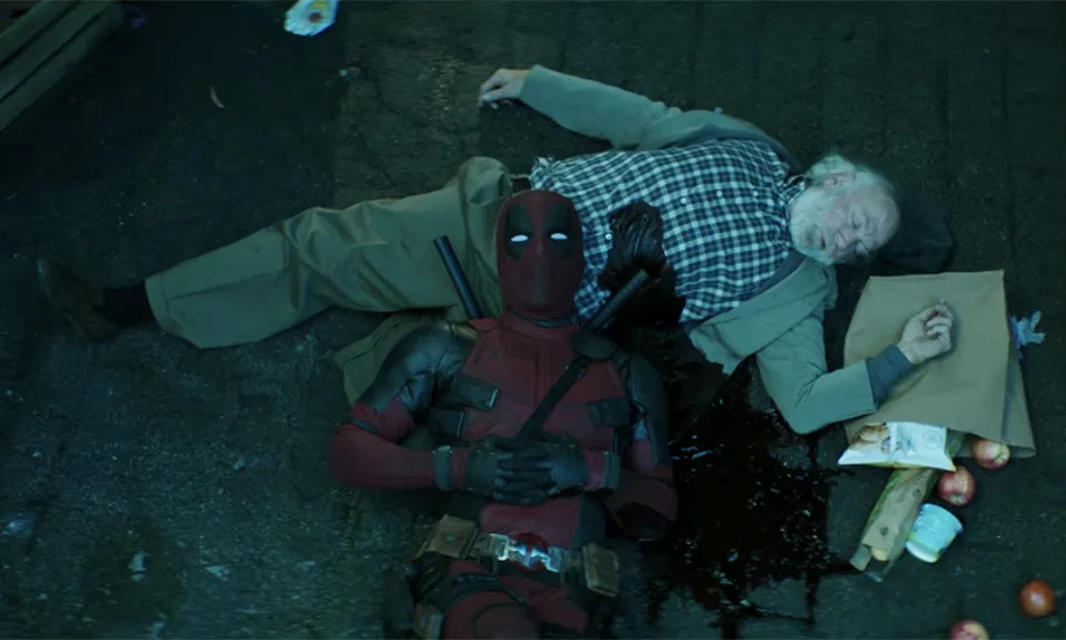 The clip opens with Wade Wilson hearing an elderly man getting attacked by a mugger in an alley just outside a movie theatre (which happens to be screening “Logan”). “Not on my watch,” he proclaims before dashing into a nearby telephone booth to change into his red and black costume.