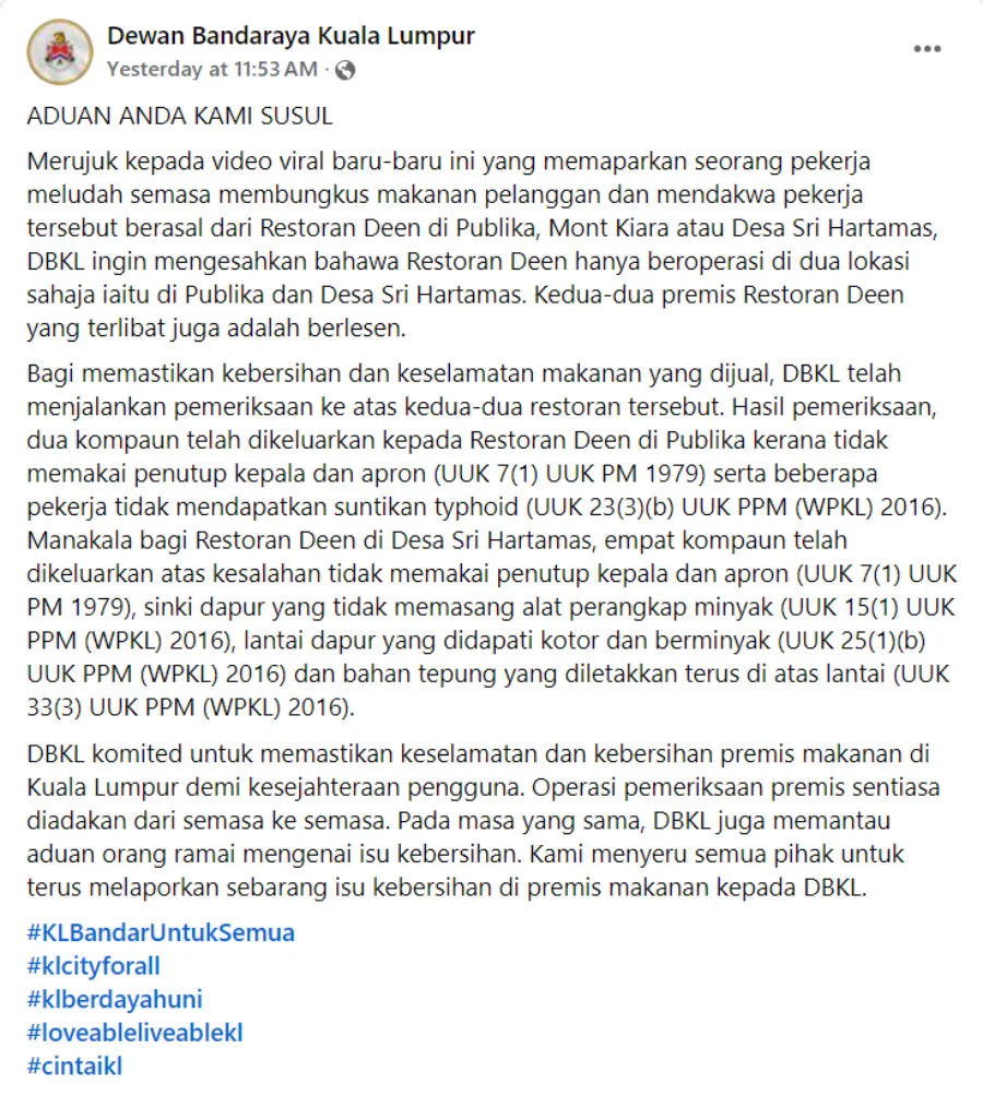 The post identified the restaurant chain as Deen’s in Publika, Mont Kiara. The restaurant also operates a branch in Desa Sri Hartamas as Nasi Kandar Deen Bistro. In its post, DBKL said it fined the Publika restaurant for failing to wear proper head coverings and aprons, thus violating the Food Handlers By-Law 1979. Several employees were also found without the required typhoid vaccination, earning them another fine under the Licensing of Food Establishments By-Law 2016.