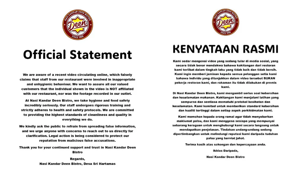 Deen Bistro in Desa Sri Hartamas was also issued four fines for similar violations. The violations include failing to wear proper head coverings and aprons, failing to install a grease trap in the kitchen sink, having dirty and greasy kitchen floors, and directly storing flour on the floor. It’s worth mentioning that Deen Bistro had denied that their employees had violated food safety regulations before DBKL’s report.
