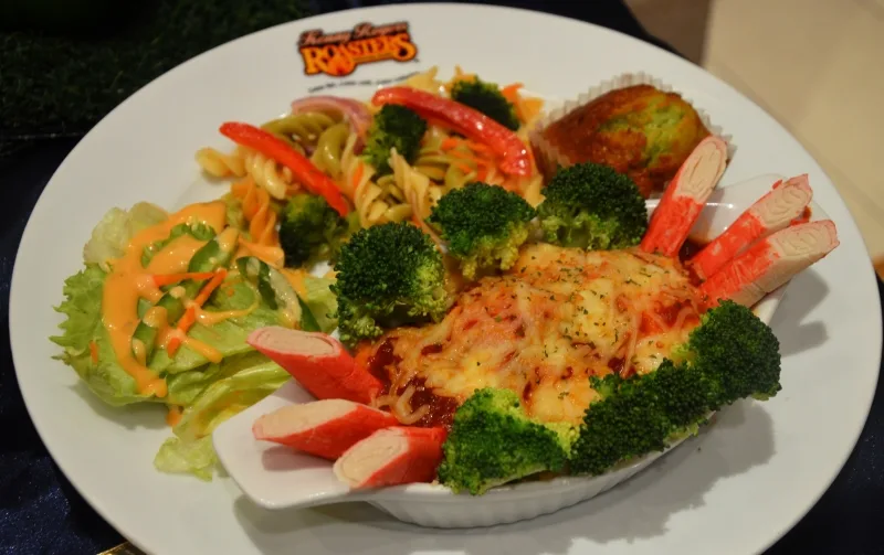 Each serving of Cheezy Rice Treasure is delectably complemented with two side dishes of choice and a Kenny’s Home-made Muffin.