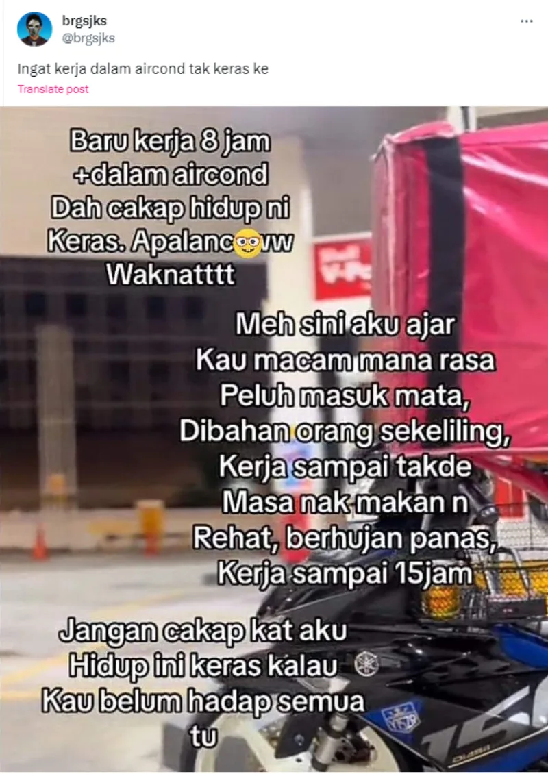 A Twitter user recently shared a screenshot of a TikTok video where a rider voiced his opinion about office workers complaining about their struggles. In the screenshot, the rider said that office workers only work 8 hours in an air-conditioned room but are already complaining about a harsh life.