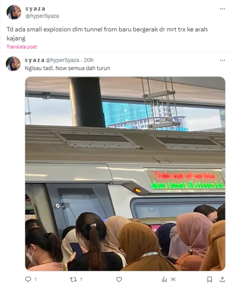 According to a tweet by Twitter user @/hyperSyaza, riders aboard a train going from MRT Tun Razak Exchange (TRX) towards Kajang at around 6pm heard a small explosion while on the train. Shortly after the supposed explosion, all passengers had to disembark from the train due to safety concerns. However, the incident caused the Kajang Line to experience a slight delay during the peak evening hours.