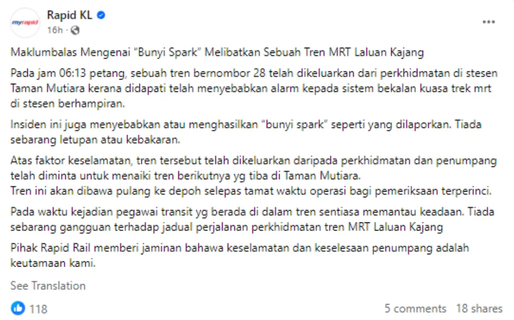Hours after the incident, Rapid KL released a statement to address the alleged explosion that passengers heard. Rapid KL clarified that the explosion was the sound of a spark caused by a train removed from service at the Taman Mutiara station. During the removal of train number ‘28’, it triggered the alarm of the MRT track power supply system at a nearby station. “The incident also produced the ‘spark sound’ that passengers heard. However, there was no explosion or fire”, the company added.